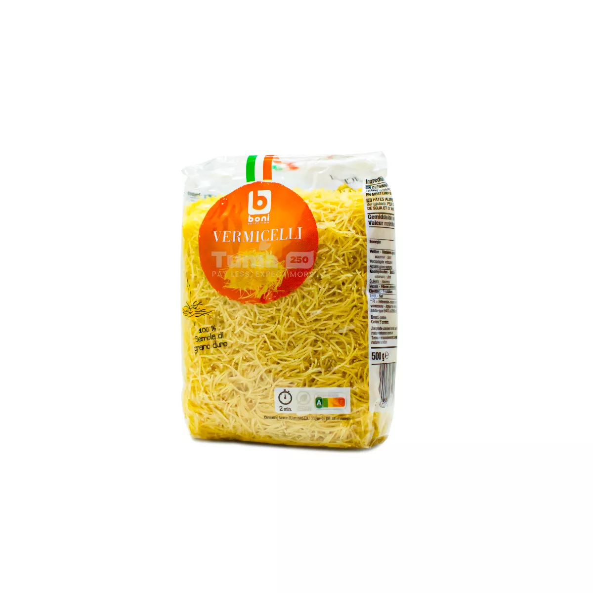 Boni Vermicelli Pasta: is a versatile and quick-cooking noodle made from high-quality durum wheat semolina. Its fine, delicate strands absorb sauces well, making it ideal for a variety of dishes such as soups, stir-fries, and salads. Packaged in a 500g bag, it’s perfect for family meals or entertaining guests.